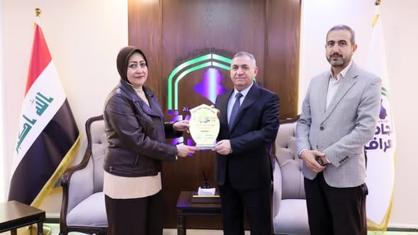 عميد كلية التربية للبنات أ.د هدى محمد صالح وعضو اللجنة التحضيرية للمهرجان أ.م.د جمال مهدي صالح يقدمان درع وشهادة التميّز الصادرة من وزارة الثقافة والسياحة والآثار للسيد رئيس الجامعة العراقية …